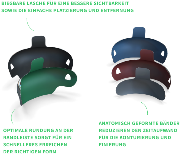 - Anatomisch geformte Bänder reduzieren den Zeitaufwand für die Konturierung und Finierung